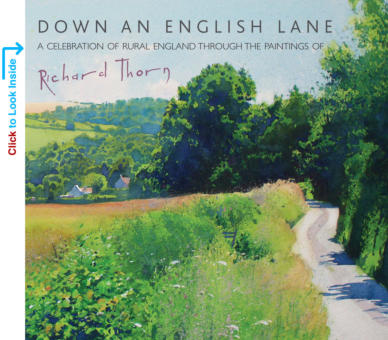Review: http://artbookreview.wordpress.c om/ Down An English Lane by Richard Thorn Billed as "a celebration of rural England", this utterly charming collection achieves exactly what it sets out to do. Richard's watercolour style is very loose and makes extensive use of washes and spattering to create an impression of a scene rather than record it in detail. With only a few exceptions, that impression is of bright sunlight and quiet calm. Figures do not appear and this is more about an idealised than a working landscape. It’s none the worse for that. Given the subject matter and that Halsgrove is a West Country publisher, I initially assumed that these were the lanes of Devon and Cornwall. Although it's not explicit anywhere, there are hints in the introductory material that I'm right. Some of the titles give hints to location ("Down Surrey Way" is perhaps further afield), but most don't and that's right. Although Richard is painting in specific places, they stand for anywhere and this is as much the creation of